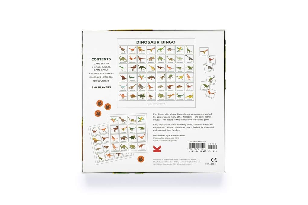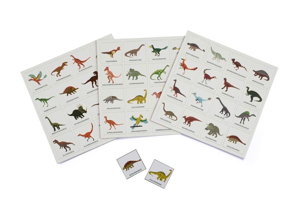 Este Bingo de dinosaurios está compuesto por 48 tokens, 8 cartas de juegos y 150 fichas.